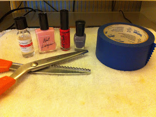 What you will need: The two colors you selected, top coat, painters tape, and the pattern scissors.